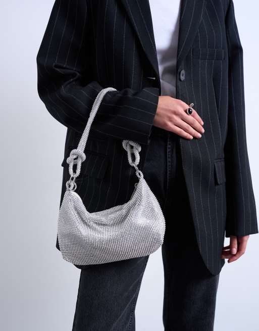 Topshop – Srebrna błyszcząca torebka na ramię zdobiona strasami
