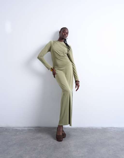 Topshop – Sukienka maxi z materiału cupro w kolorze khaki z kopertowym dekoltem
