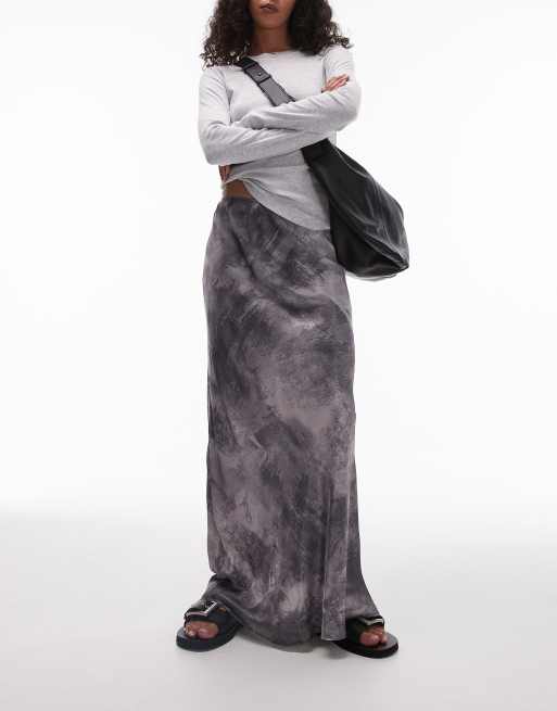 Topshop – Szara satynowa spódnica maxi cięta ze skosu, ze wzorem