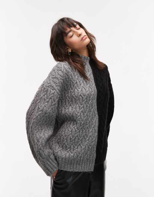 Topshop – Szaro-czarny sweter oversize o warkoczowym splocie ze wzorem pół na pół