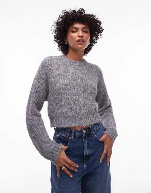 Topshop – Szary krótki kardigan z puszystej dzianiny o warkoczowym splocie