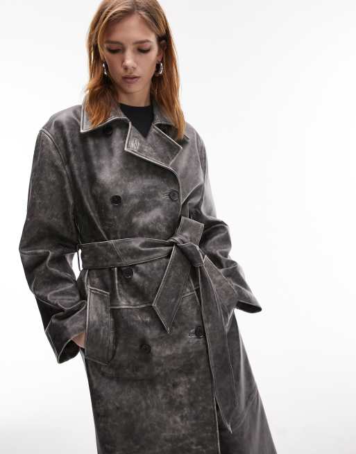 Topshop – Szary prochowiec ze skóry naturalnej z efektem sprania