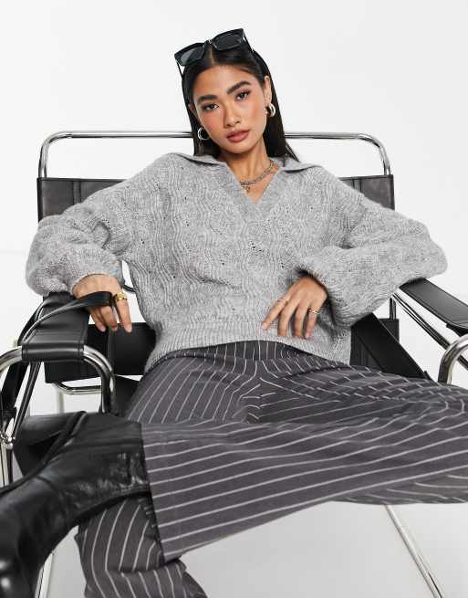 Topshop – Szary sweter dzianinowy z dzierganym kołnierzykiem