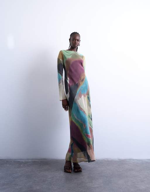 Topshop – Szyfonowa sukienka maxi z prostym dekoltem w abstrakcyjny wzór