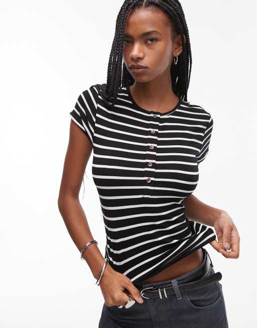 Topshop – Top z dekoltem typu henley, krótkimi rękawami i wzorem w czarno-białe paski