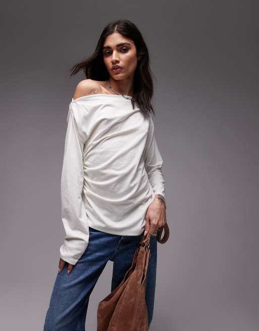 Topshop – Top z długim rękawem i asymetrycznym dekoltem w kolorze złamanej bieli