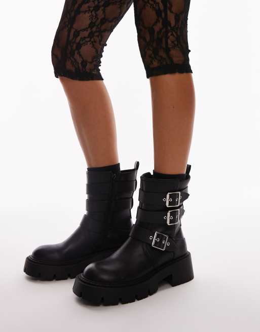 Topshop Wide Fit – Luke – Czarne botki typu biker na grubej podeszwie ze sprzączkami