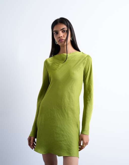 Topshop – Zielona satynowa sukienka mini z długimi rękawami i drapowanym tyłem