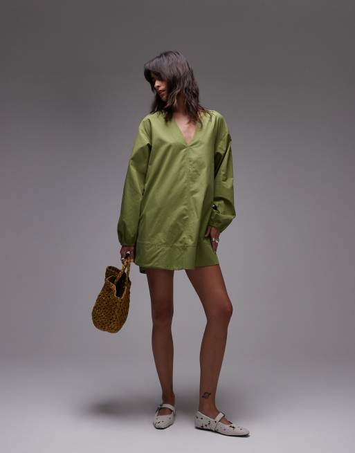 Topshop – Zielona sukienka mini w stylu babydoll z popeliny