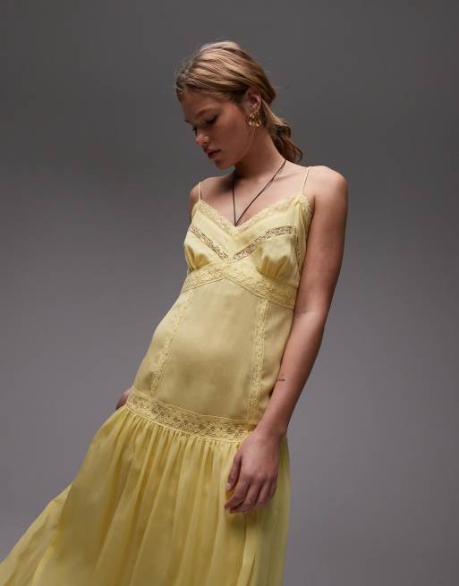 Topshop – Żółta szyfonowa sukienka midi z koronkowymi wstawkami