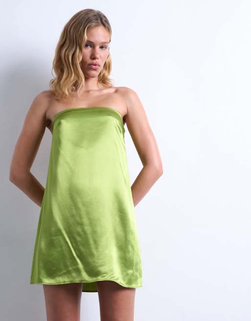 Topshop – Żółtozielona satynowa sukienka mini z dekoltem bandeau