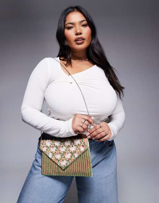 True Decadence – Zdobiona różowo-zielona kopertówka z kwiatowym wzorem z koralików