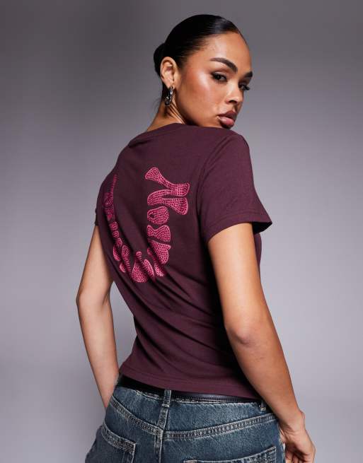 True Religion – Bordowa krótka koszulka z logo z diamencików na plecach