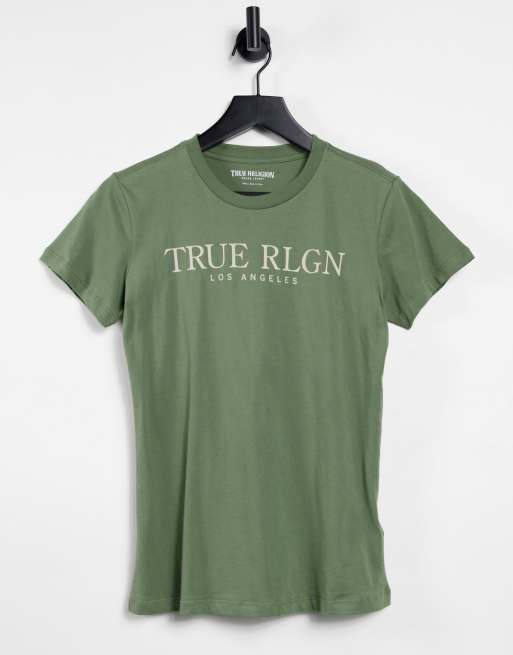 True Religion – Oliwkowy T-shirt z okrągłym dekoltem i logo