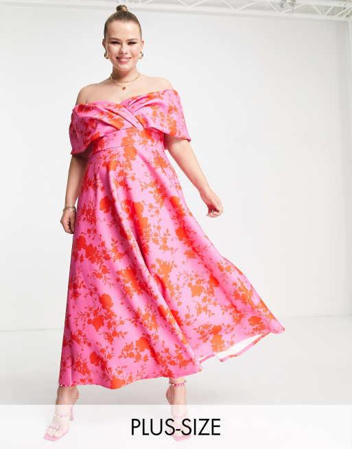 True Violet Plus – Czerwono-różowa sukienka midi w kwiaty z odkrytymi ramionami