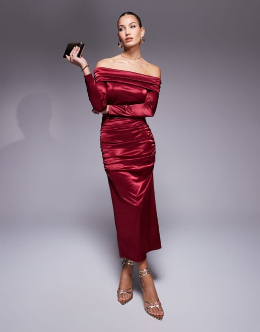 True Violet – Bordowa satynowa marszczona sukienka midi z dekoltem bardot i długimi rękawami