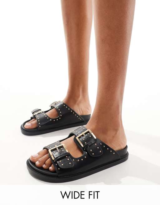 Truffle Collection Wide Fit – Czarne sandały z dwoma paskami z ćwiekami i wkładką