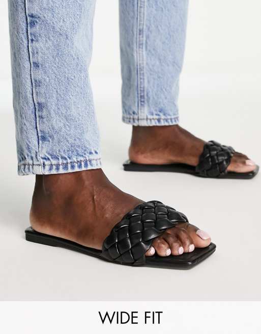Truffle Collection Wide Fit – Czarne wsuwane klapki z kwadratowymi noskami z ozdobną plecionką