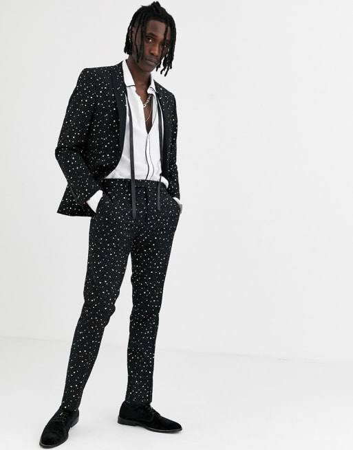 Twisted Tailor – Czarny bardzo obcisły smoking w złote flokowane groszki