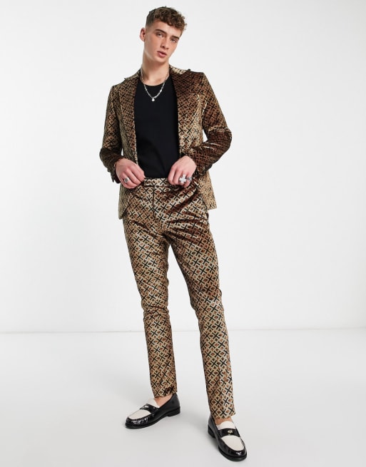 Twisted Tailor – Varane – Brązowy obcisły zestaw garniturowy w geometryczny wzór z logo