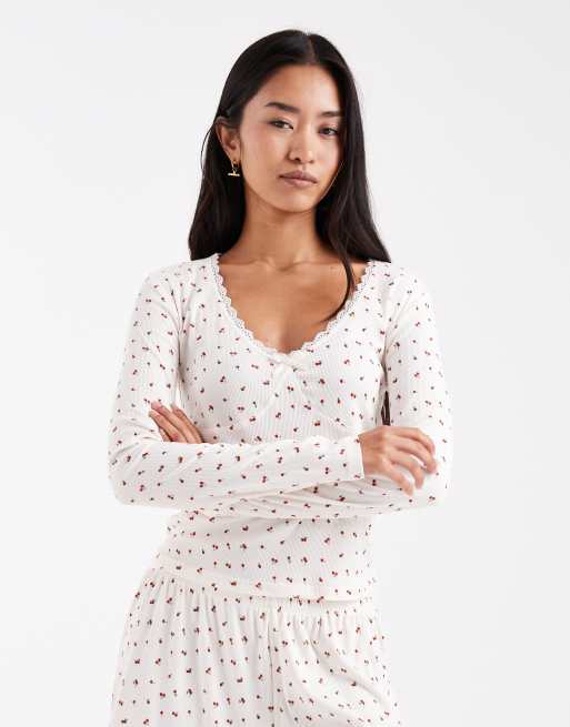 Urban Threads – Beżowa prążkowana góra od piżamy z długimi rękawami i wzorem w wisienki