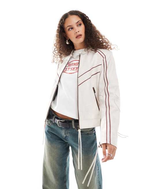 Urbancode – Biała skórzana kurtka motocyklowa z kołnierzem i efektem znoszenia