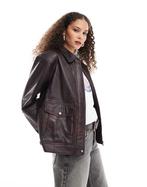 Urbancode – Ciemnoczerwona skórzana kurtka harrington z efektem znoszenia i kieszeniami