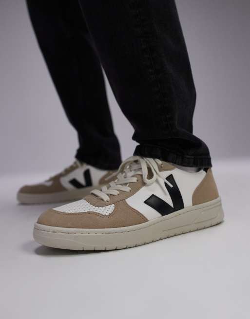 VEJA – V-10 – Białe skórzane buty sportowe z beżowymi i czarnymi wstawkami