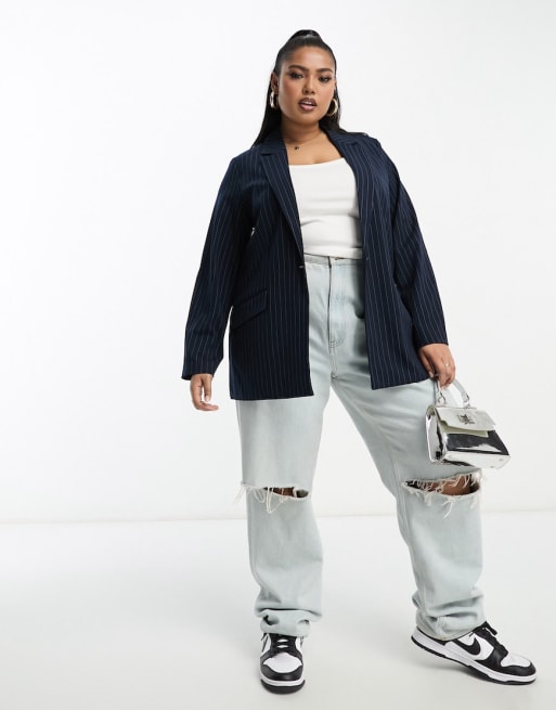 Vero Moda Curve – Granatowy zestaw w prążki: dopasowana marynarka i spodnie z szerokimi nogawkami