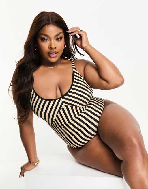 Vero Moda Curve – Kremowy strój kąpielowy w czarne paski z wiązanymi ramiączkami