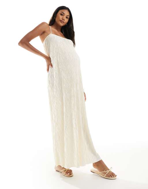 Vero Moda Maternity – Jasnokremowa fakturowana sukienka plisowana maxi na ramiączkach