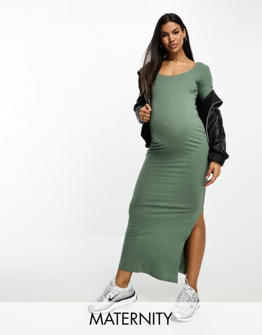 Vero Moda Maternity – Sukienka midi bodycon z rozcięciem z boku w kolorze khaki