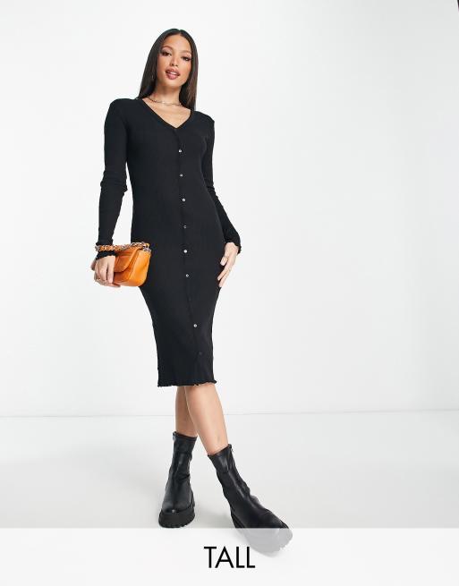 Vero Moda Tall – Czarna prążkowana sukienka midi z zapięciem na guziki