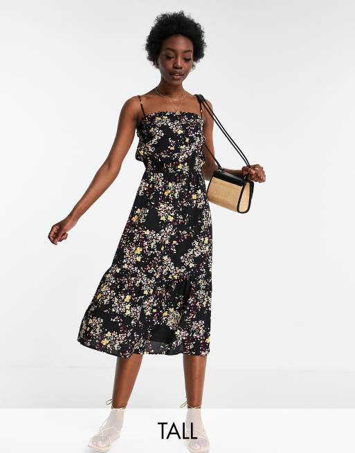 Vero Moda Tall – Czarna sukienka midi na ramiączkach w drobne kwiaty