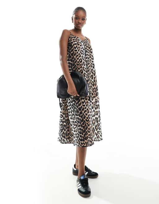 Vero Moda Tall – Sukienka midi na ramiączkach z dekoltem w szpic z tkaniny we wzór w cętki