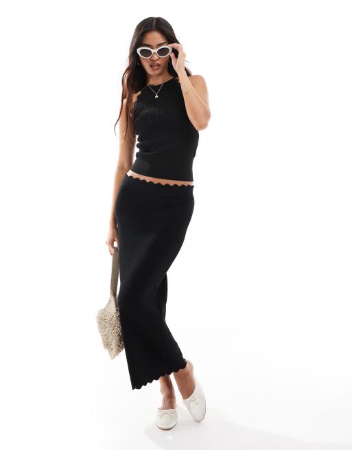 Vero Moda – Aware – Czarny prążkowany dzianinowy zestaw z podkoszulkiem bez rękawów i spódnicą maxi z muszelkowym wykończeniem