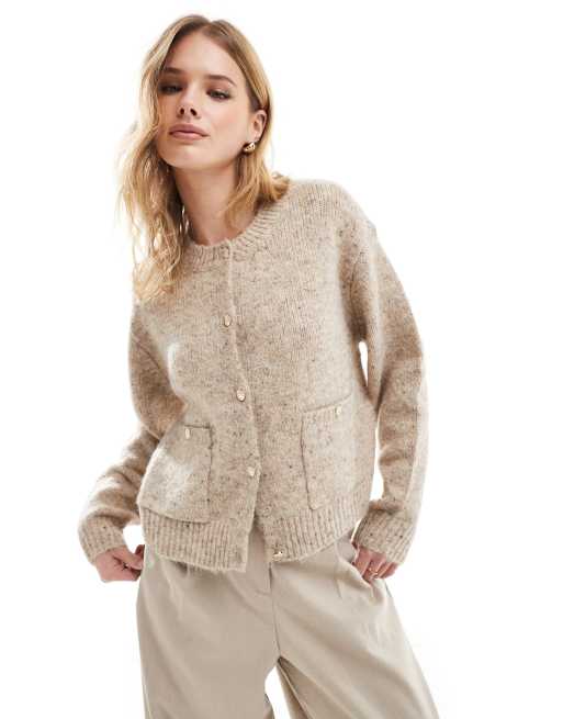 Vero Moda – Beżowy melanżowy kardigan o luźnym kroju z metalowymi guzikami