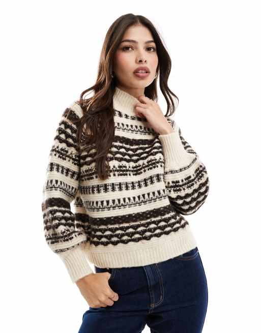 Vero Moda – Brązowo-kremowy gruby sweter w skandynawski wzór