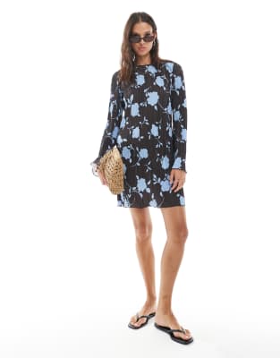 Vero Moda – Brązowo-niebieska plisowana sukienka mini z długimi rękawami w kwiatowy wzór