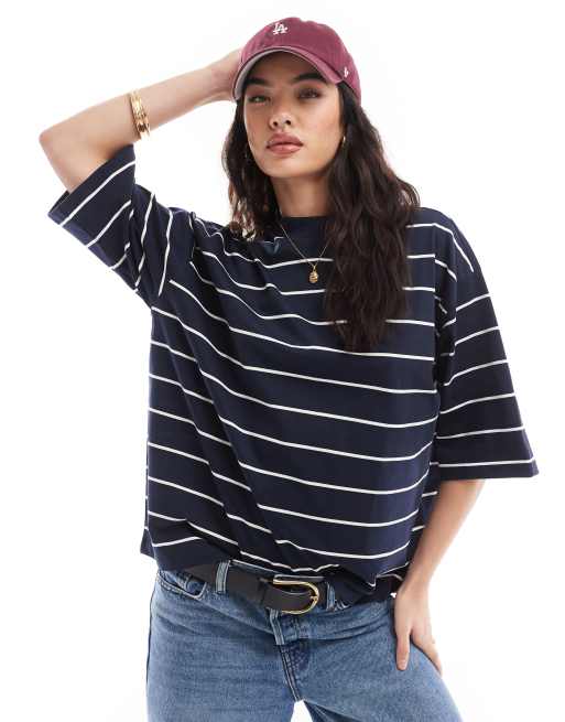 Vero Moda – Granatowy T-shirt z zabudowanym dekoltem i obniżoną linią ramion w paski