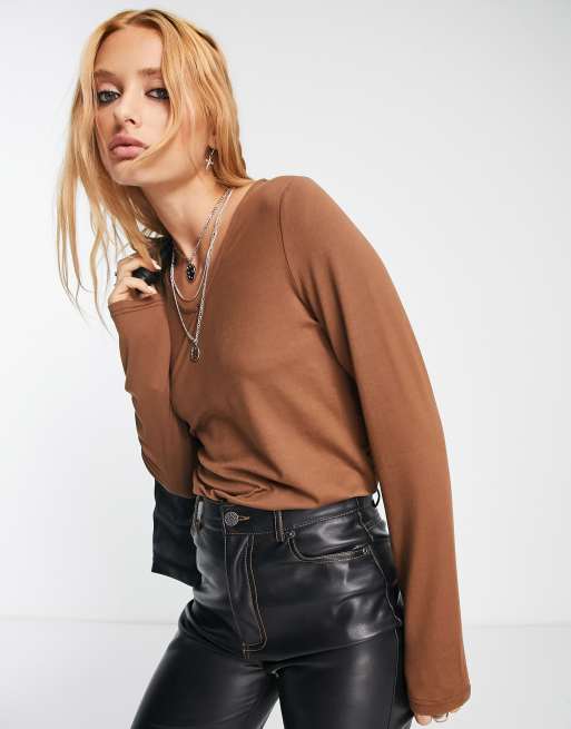 Vero Moda –Jasnobrązowy top z okrągłym dekoltem i długimi rękawami