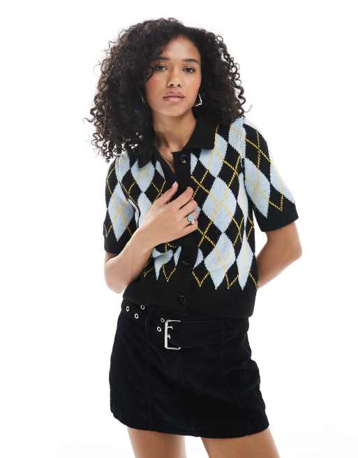 Vero Moda – Kardigan z krótkim rękawem i kołnierzykiem polo we wzór w niebieskie romby