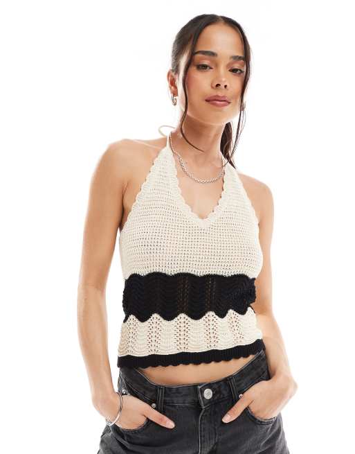 Vero Moda – Kremowo-czarny szydełkowany top z dekoltem halter