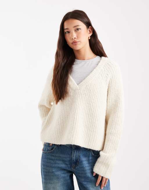 Vero Moda – Kremowy sweter z miękkiej puszystej dzianiny z dekoltem w szpic