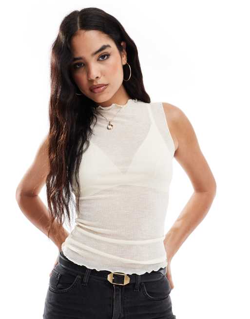 Vero Moda – Lekki dżersejowy top bez rękawów z karbowanym wykończeniem w kremowym kolorze