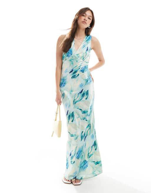 Vero Moda – Niebieska sukienka maxi w abstrakcyjny wzór z dekoltem w kształcie litery V i odkrytymi