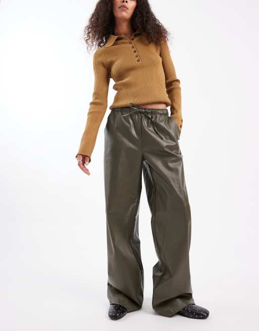 Vero Moda – Spodnie z szerokimi nogawkami i wiązaniem w talii z imitacji skóry w kolorze khaki