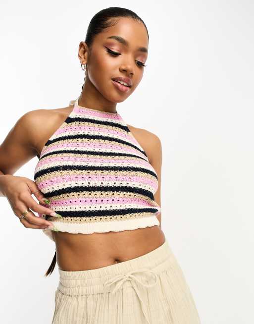 Vero Moda – Szydełkowany top z dekoltem halter w granatowo-różowe paski