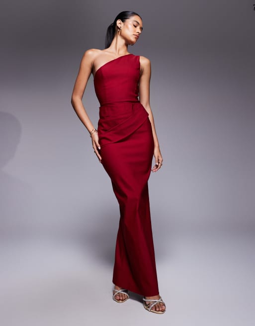 Vesper – Bordowa sukienka maxi z bengaliny na jedno ramię z drapowaniem w talii