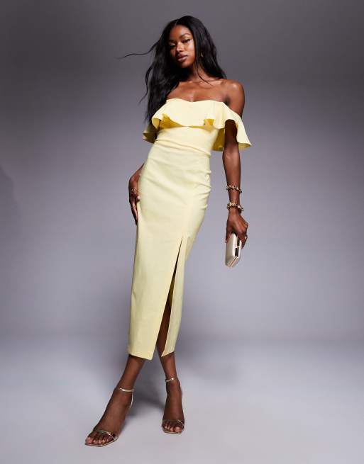 Vesper – Cytrynowa sukienka midi z bengaliny z dekoltem bardot z falbanką i rozcięciem z boku